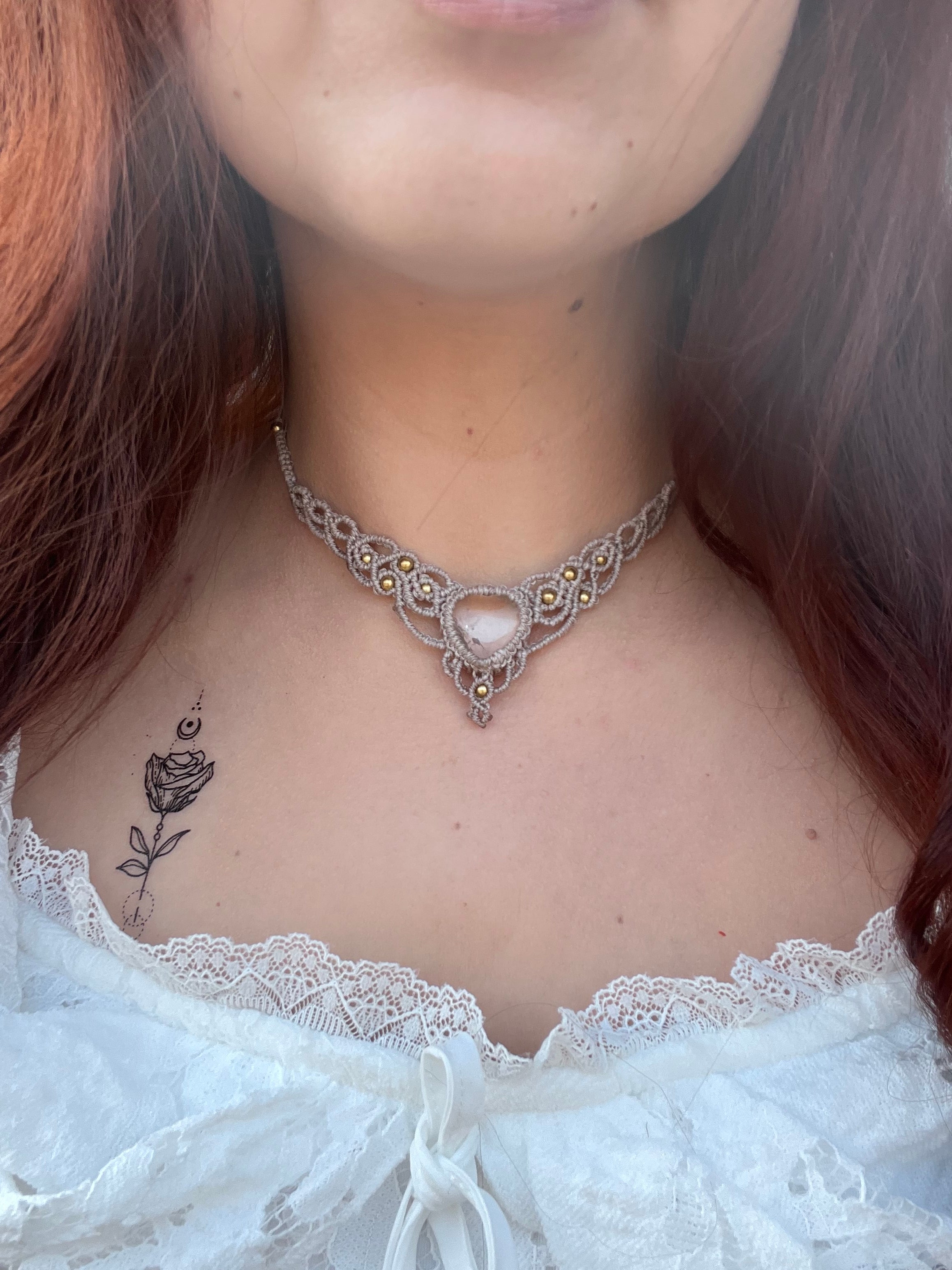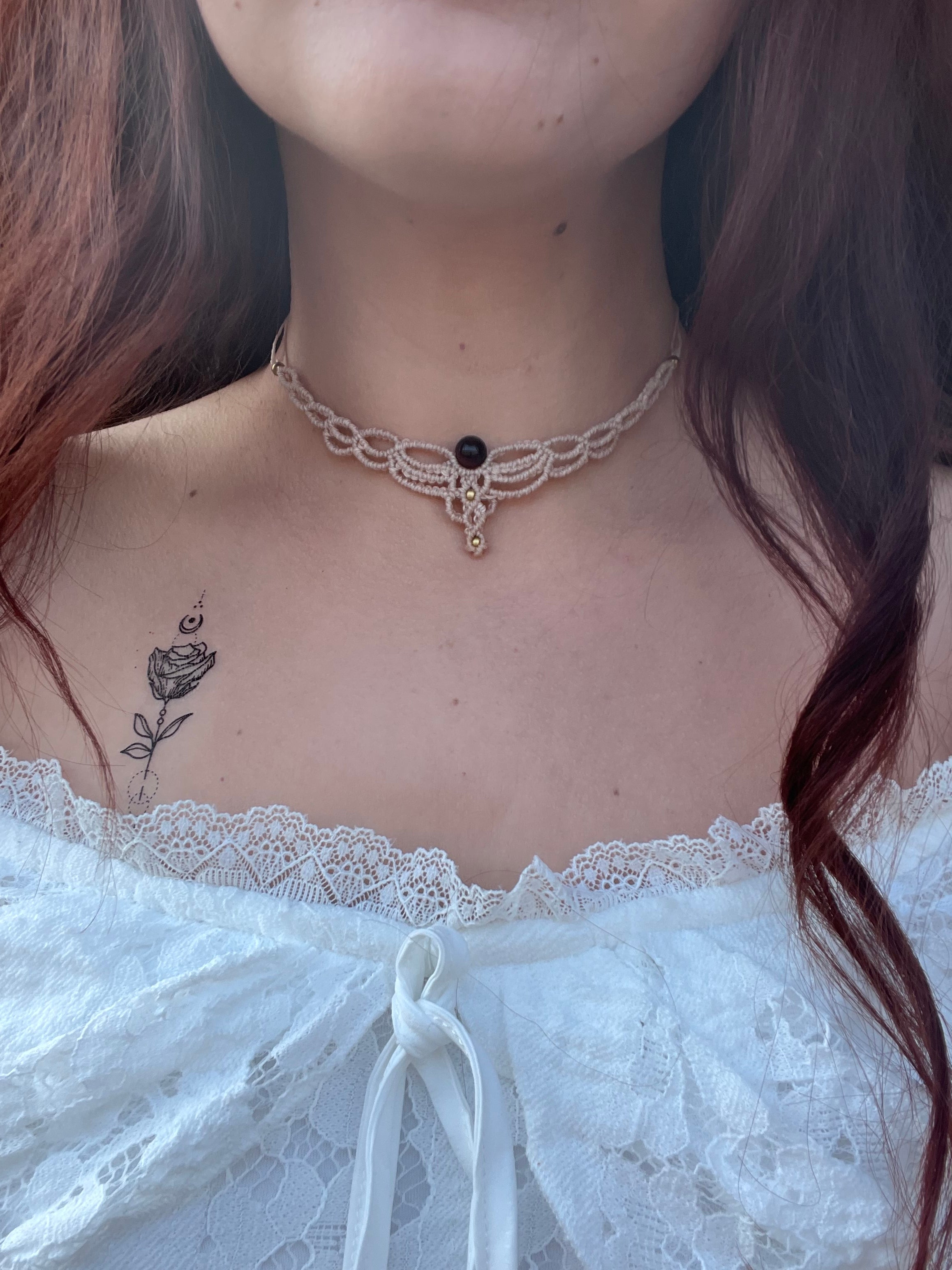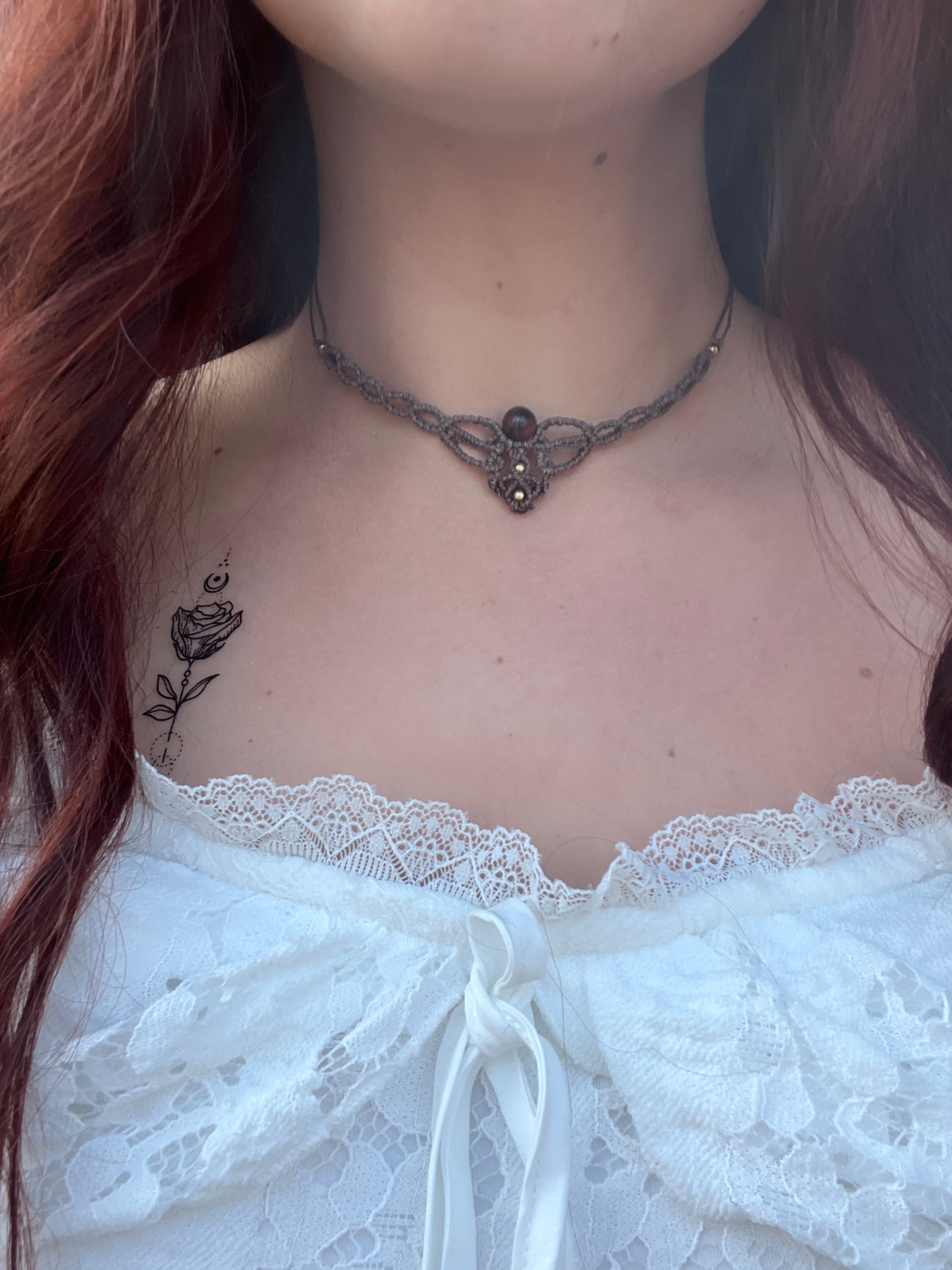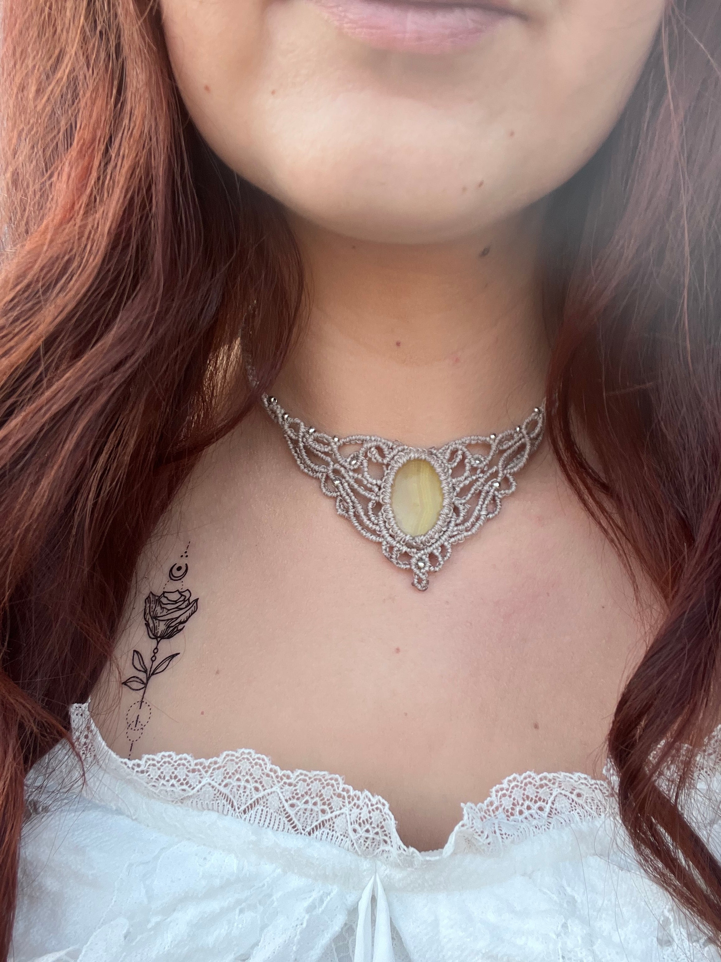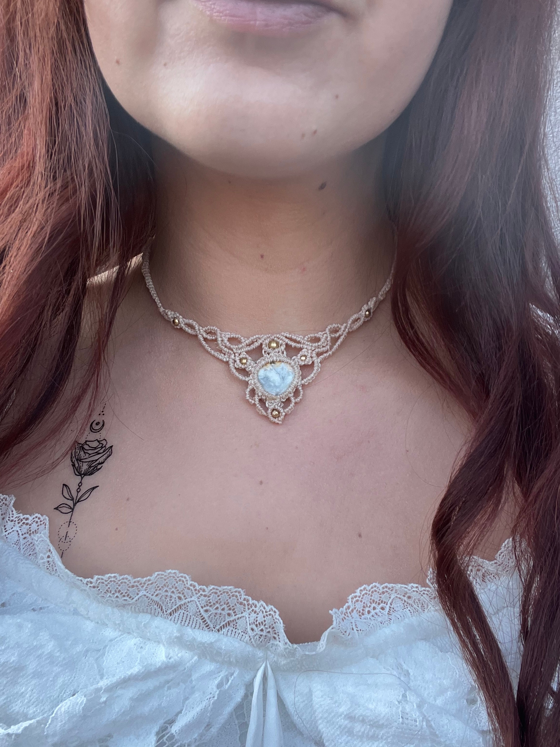 850,00 Kč850,00 Kč/Tento náhrdelník působí mysticky, jemně a lehce goticky. Velmi tmavě modrý macramé vzor a zelenkavý kámen mají lesní až čarodějný nádech. Uprostřed nese kámen moss agate (mechový...