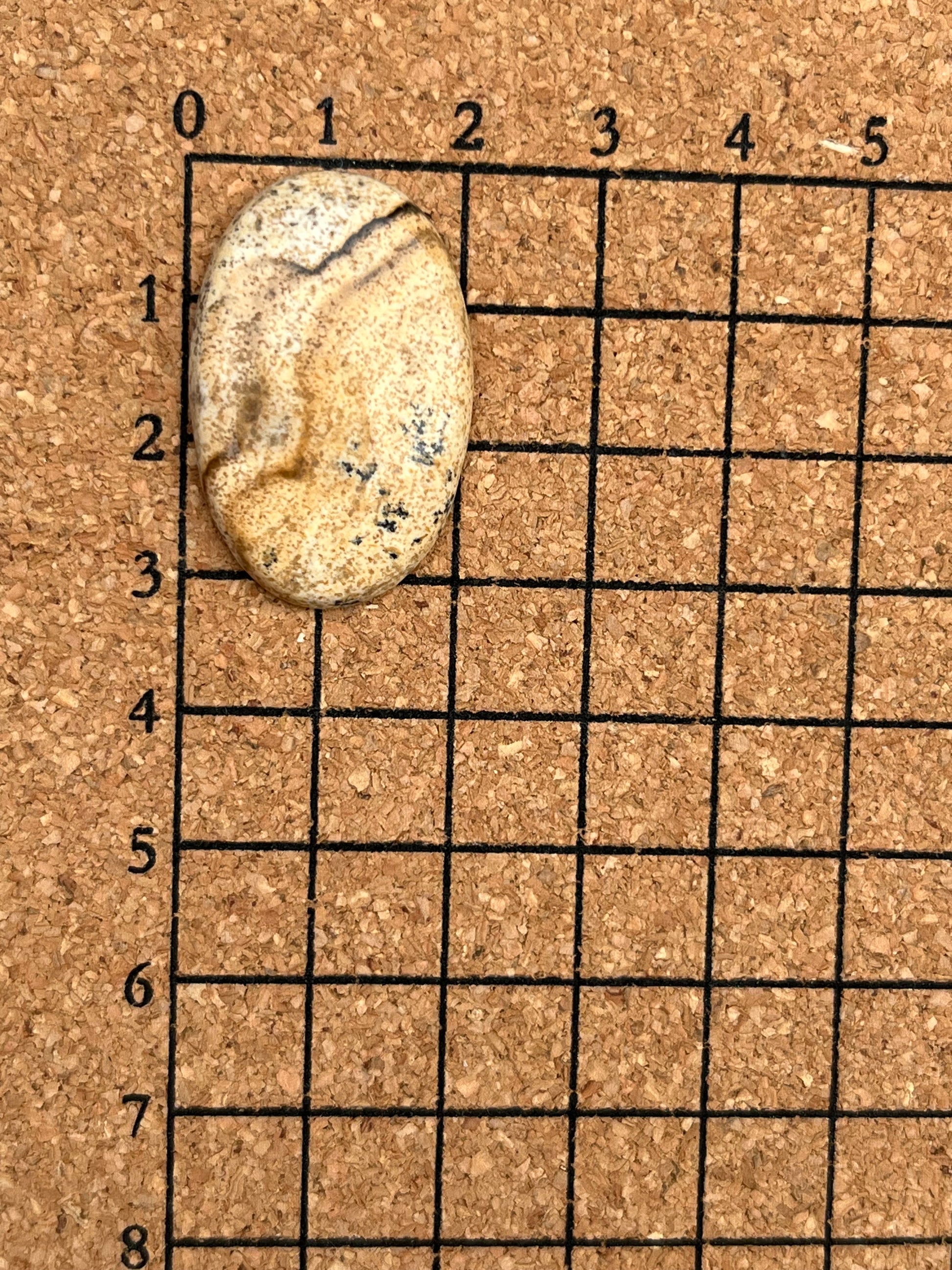 Jaspis původem z Madagaskaru. Velikost dle obrázku na centimetrové podložce. Proslulý kresbami a vzory, které připomínají krajiny, hory, pouště, stromy, nebo písečné duny.