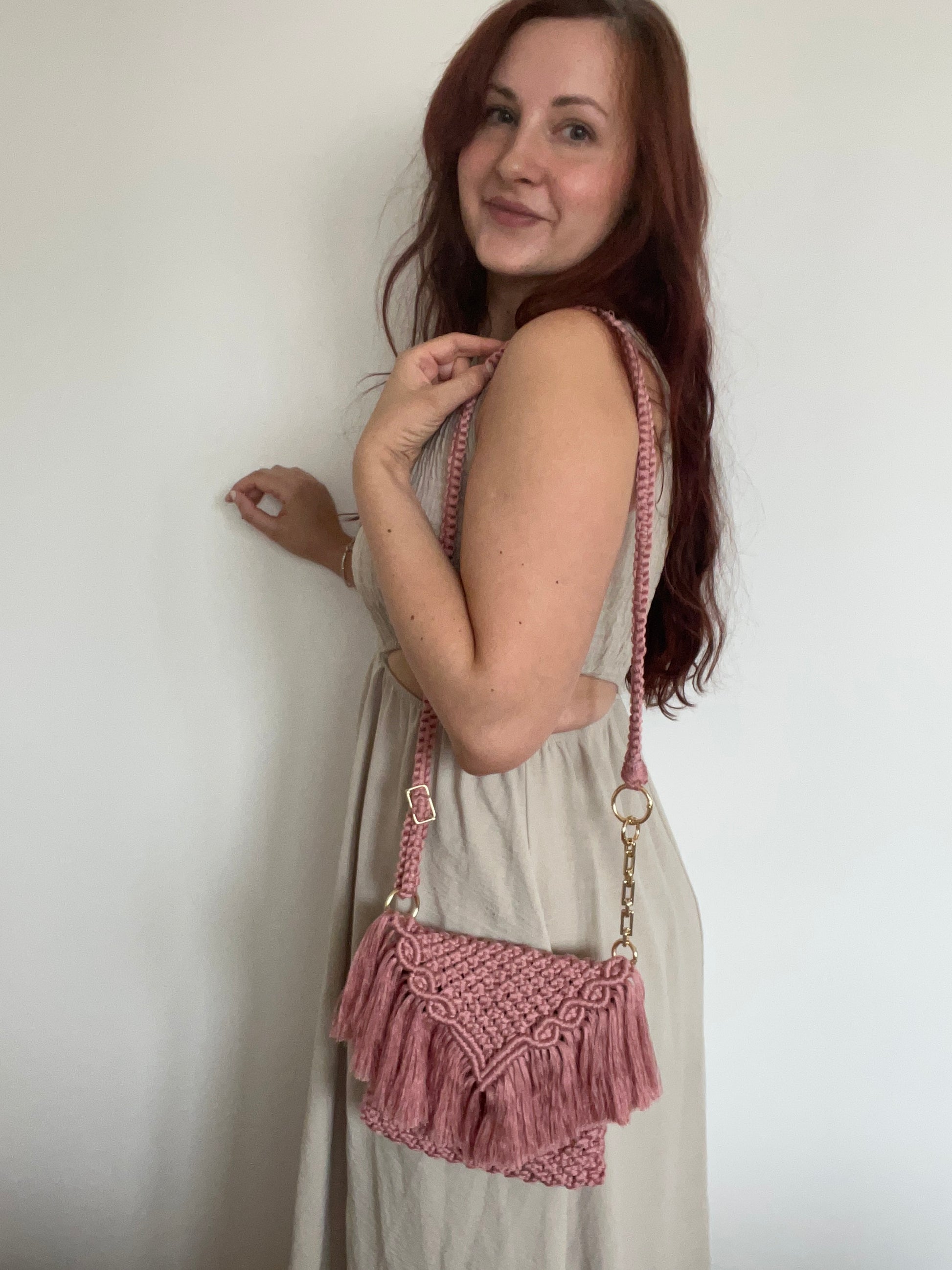 Tato kabelka je vyrobena z prémiové bambusové Macrame příze v barvě pink pearl. Je příjemná a měkká na dotek se sametovým odleskem. Je vybavena nastavitelnými popruhem a doplňky v barvě zlata.