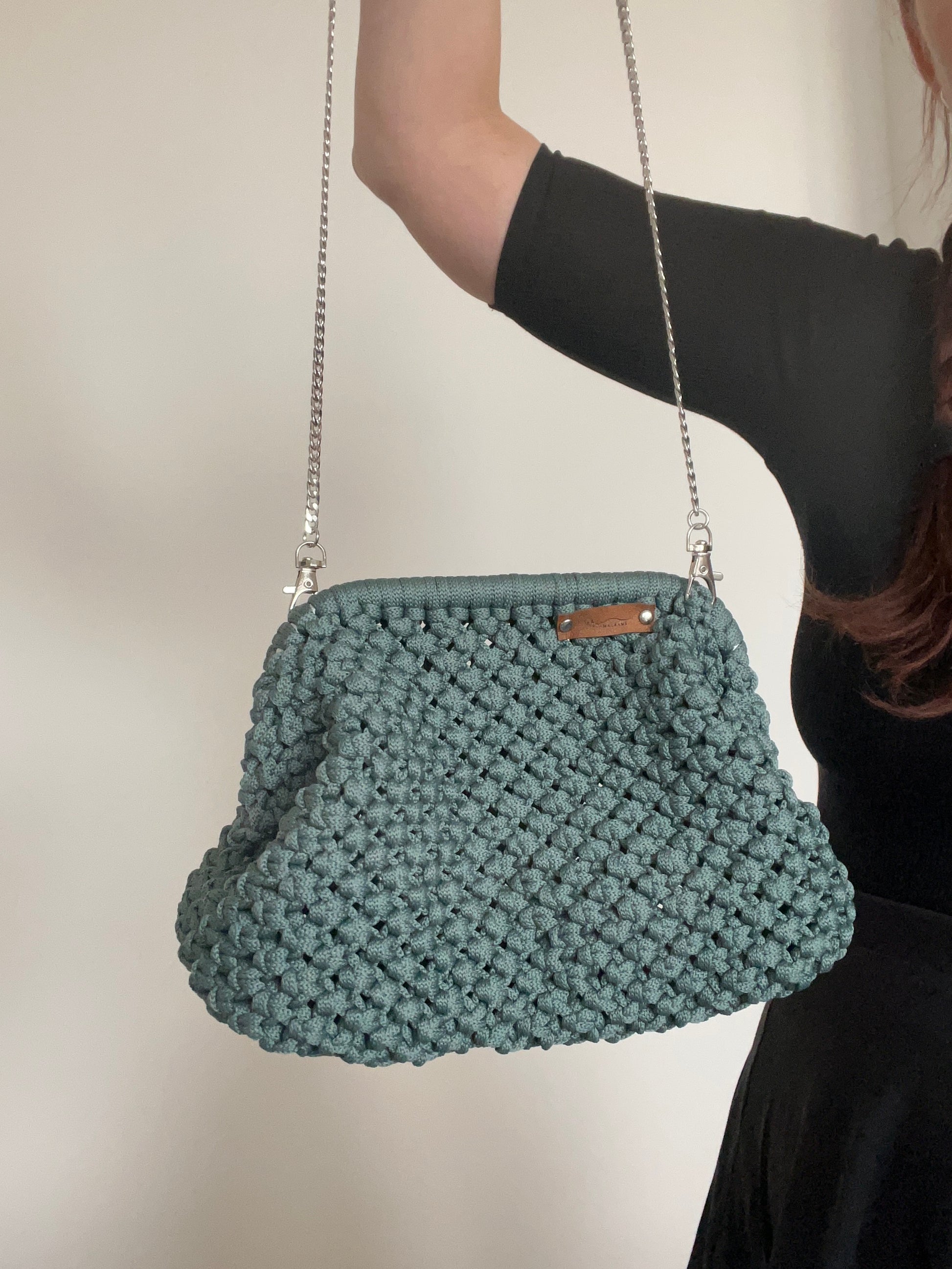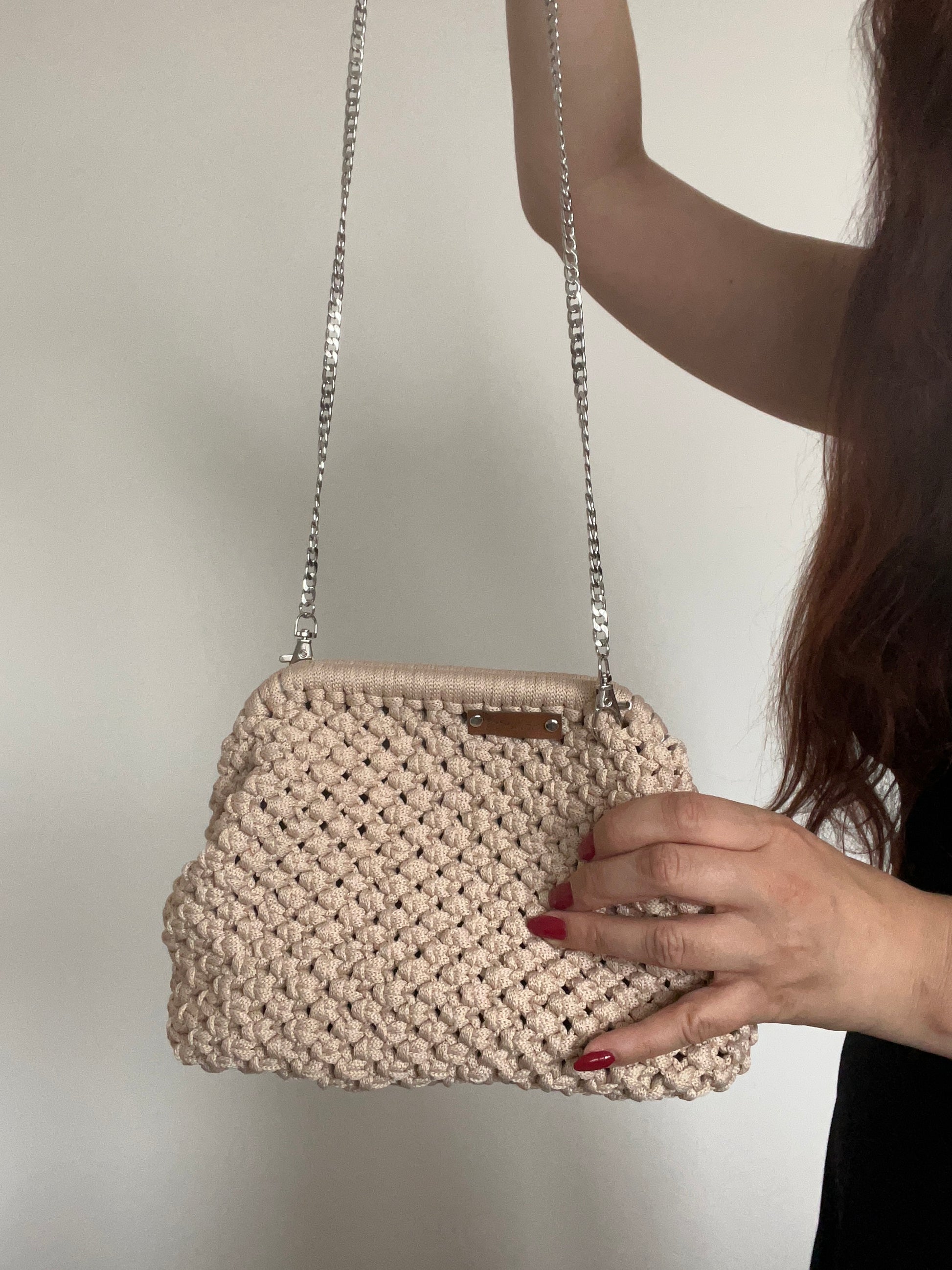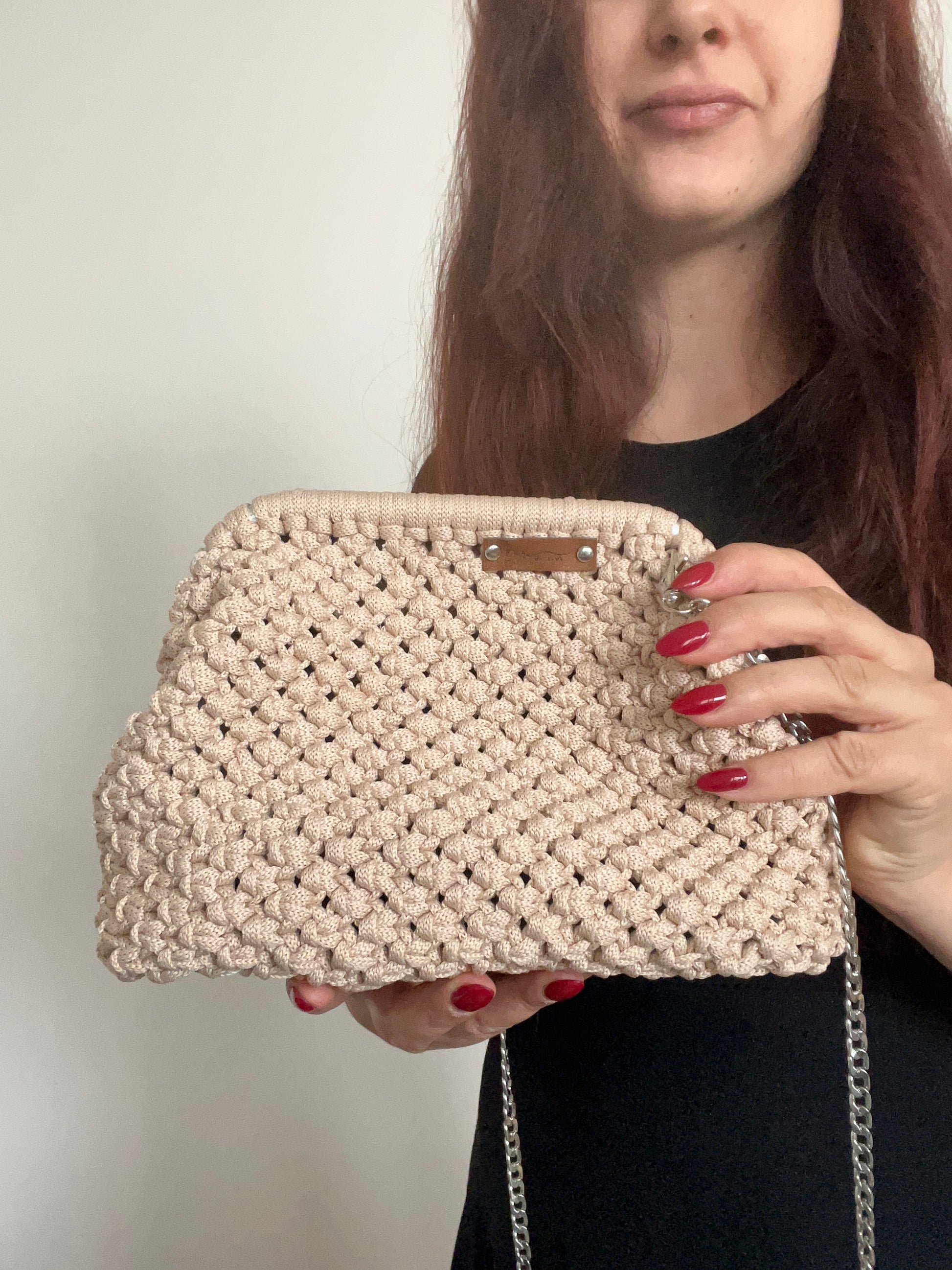 Tato krásná klipsová kabelka je bezpečná a pohodlná pro nošení. Je vyrobena ručně čtvercovým uzlem.