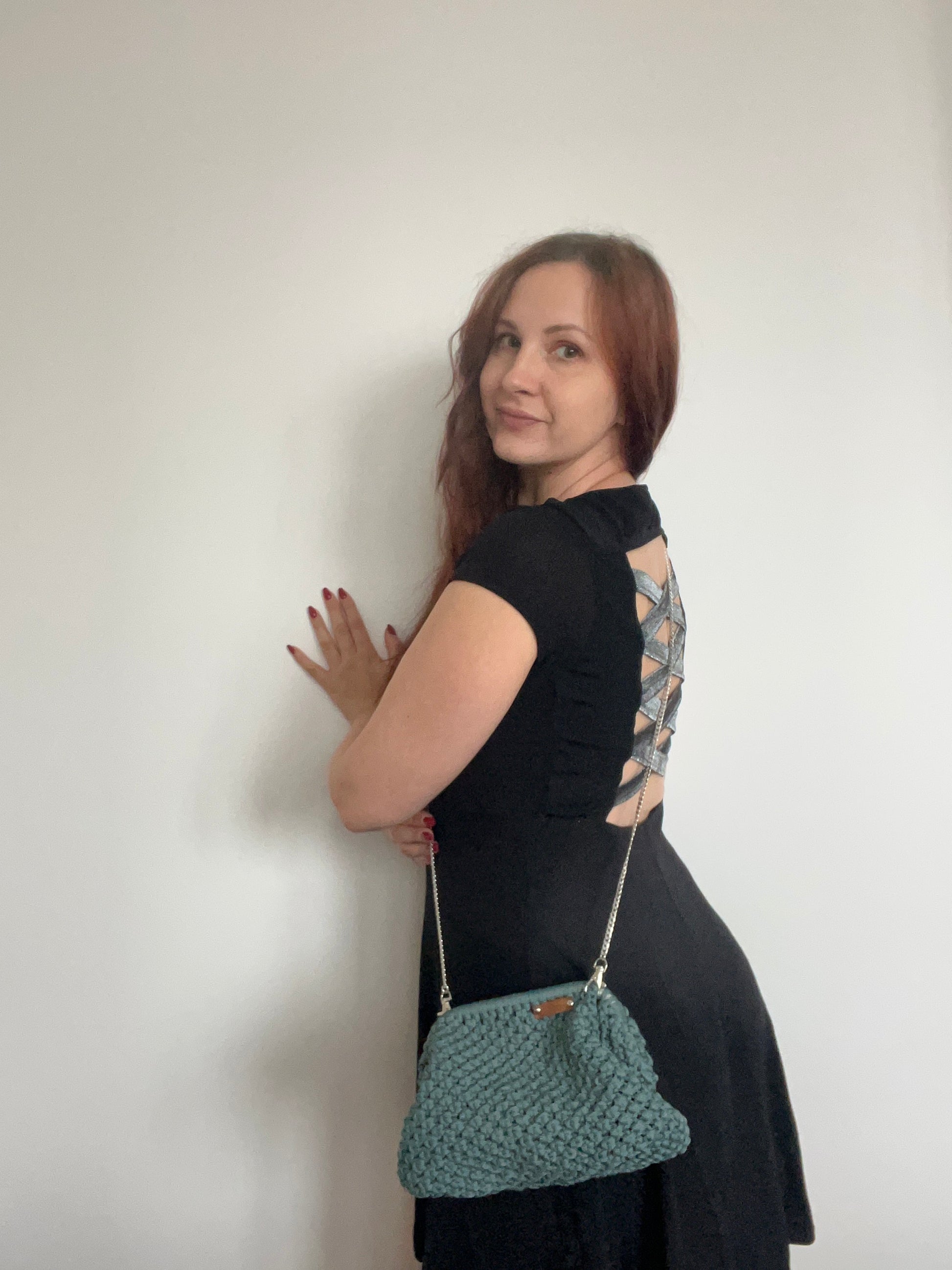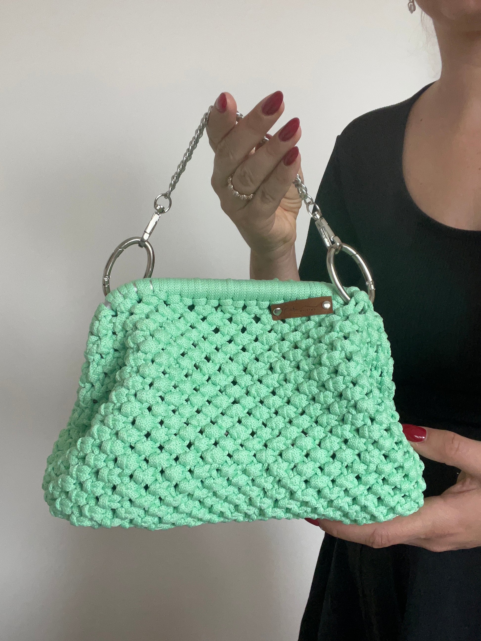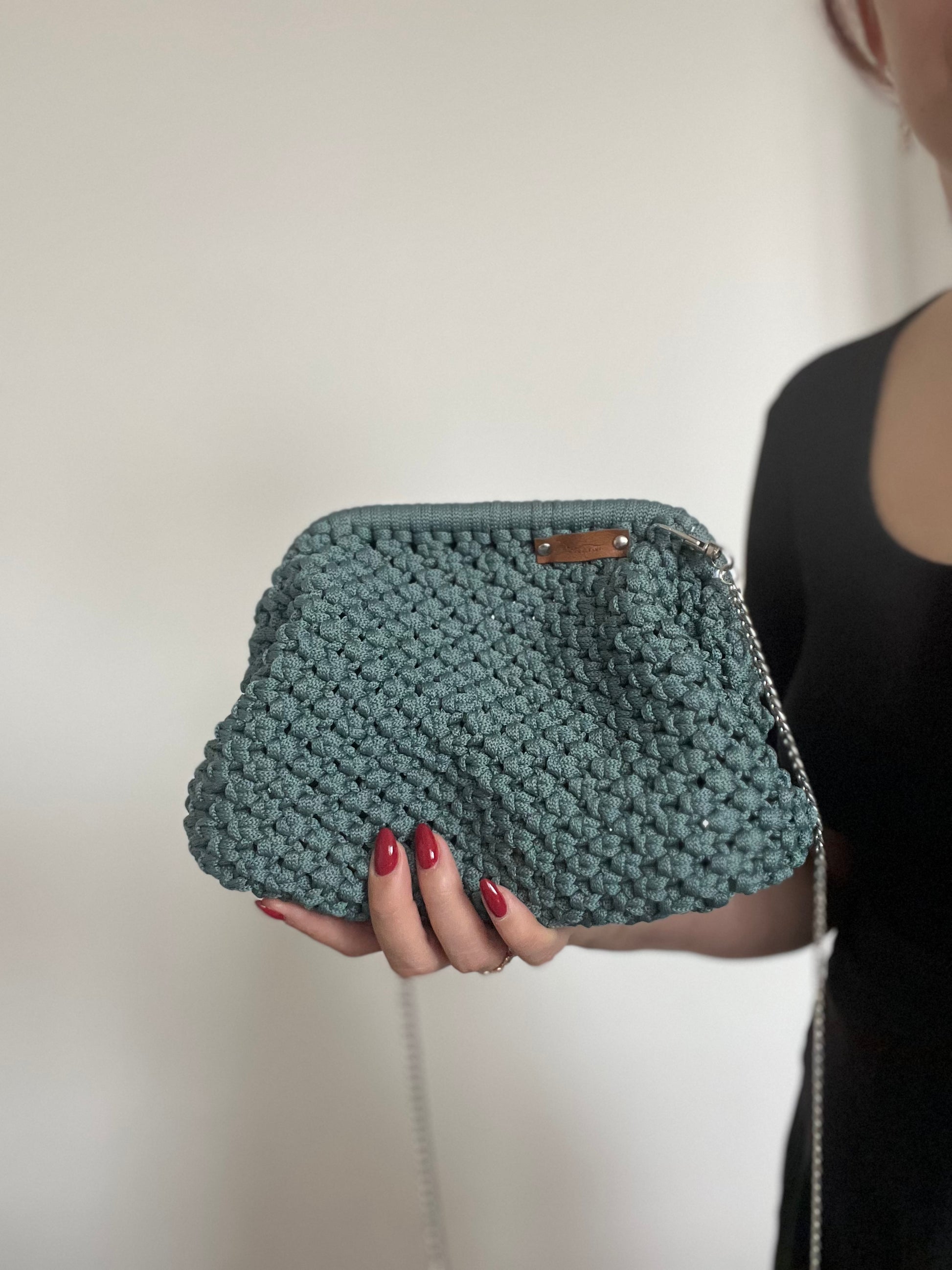 Tato krásná klipsová kabelka je bezpečná a pohodlná pro nošení. Je vyrobena ručně čtvercovým uzlem.