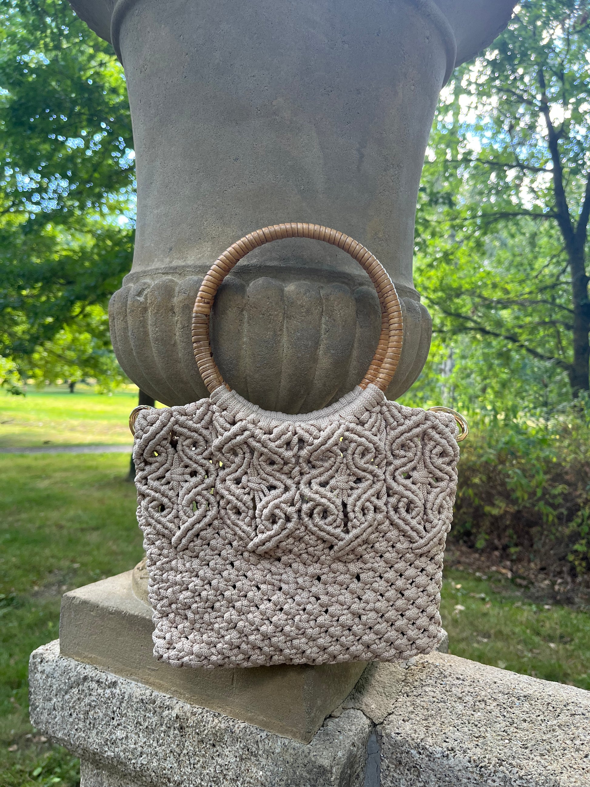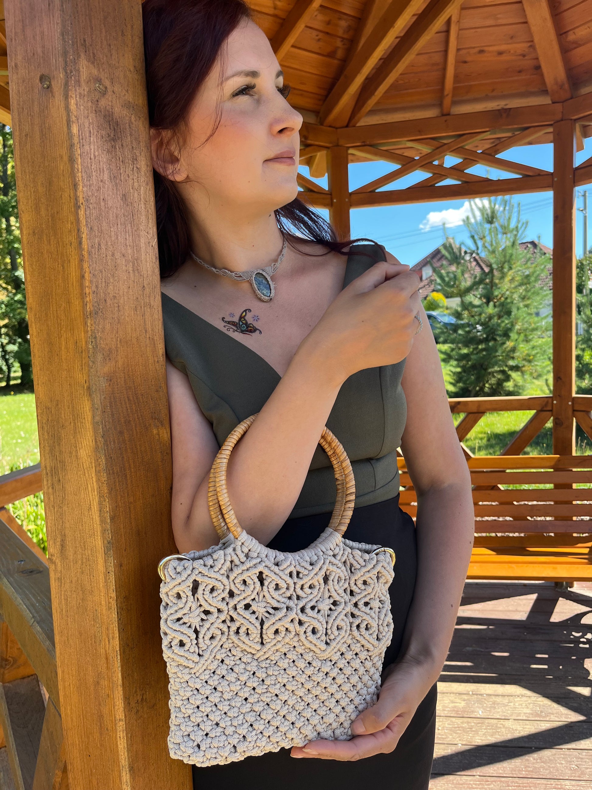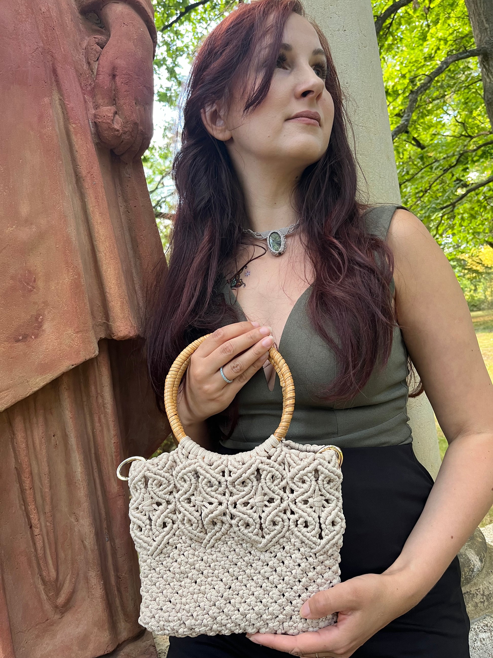 Kapučínová kabelka s keltským vzorem Vás určitě nadchne stejně jako mě. Tato kabelka má ucha z přírodního ratanu a jemná kapučínová barva se hodí ke všemu. Horní část zdobí neotřelý keltský macrame vzor a dolní část je spleten základním tzv. čtvercovým uzlem, takže vám z kabelky nic nevypadne!
