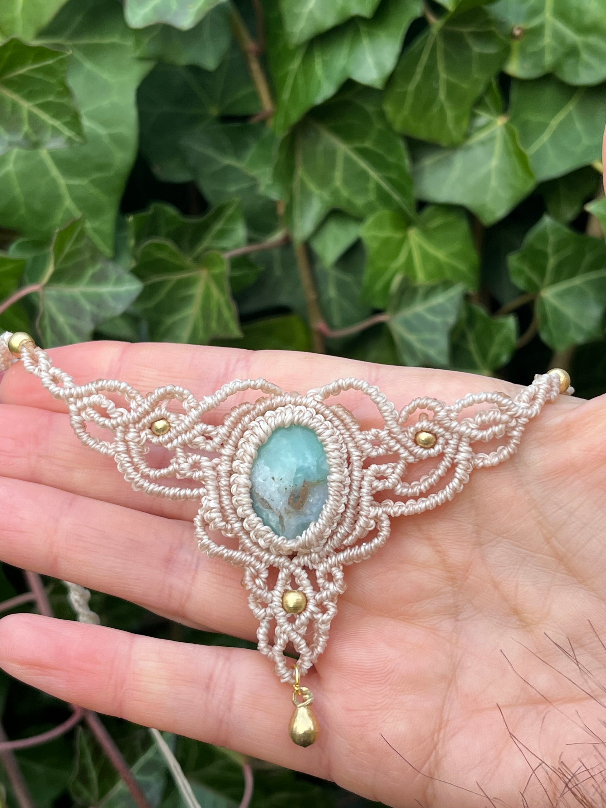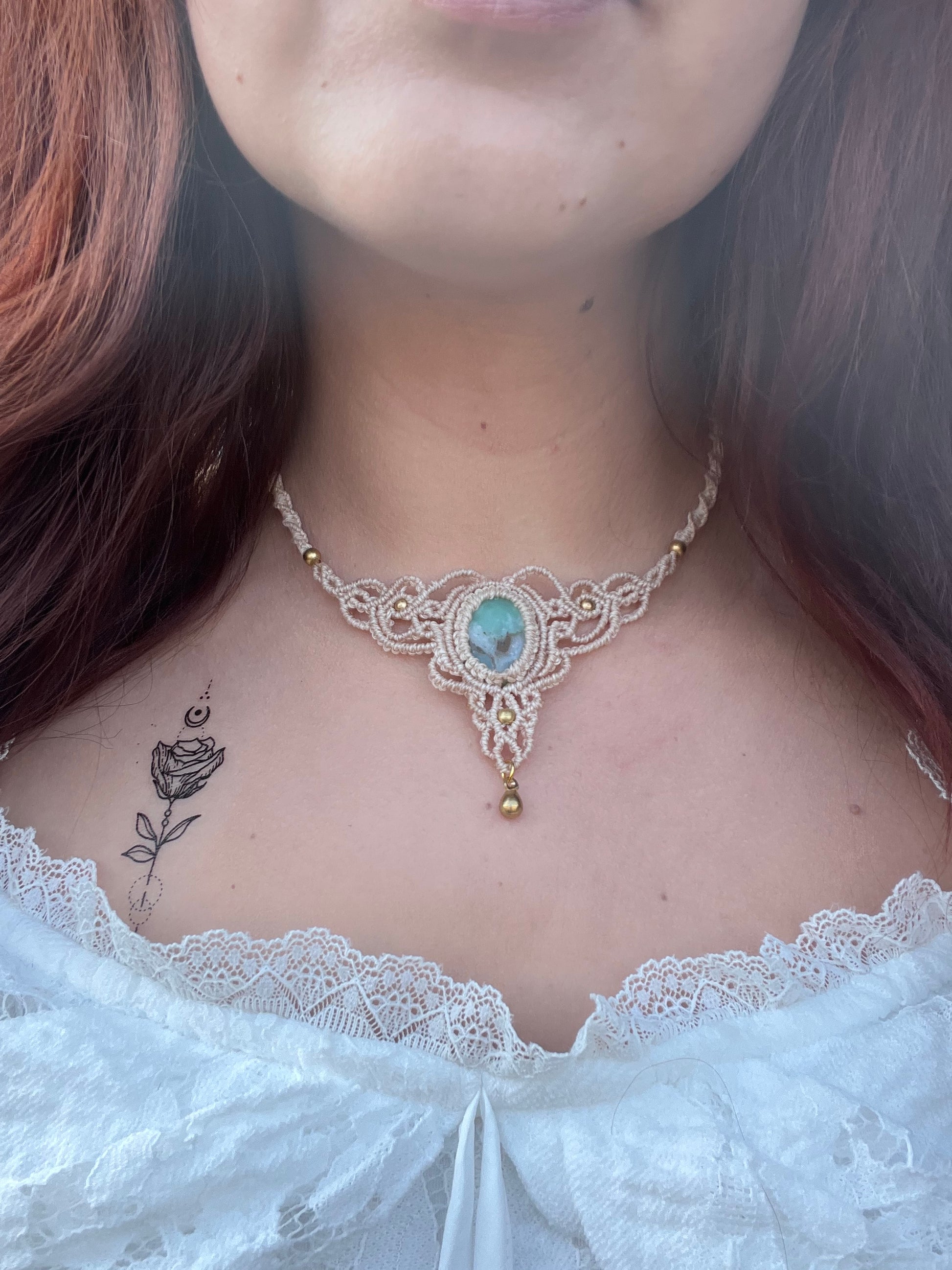 Tento ručně drhaný náhrdelník nese uprostřed kámen Chryzopras.