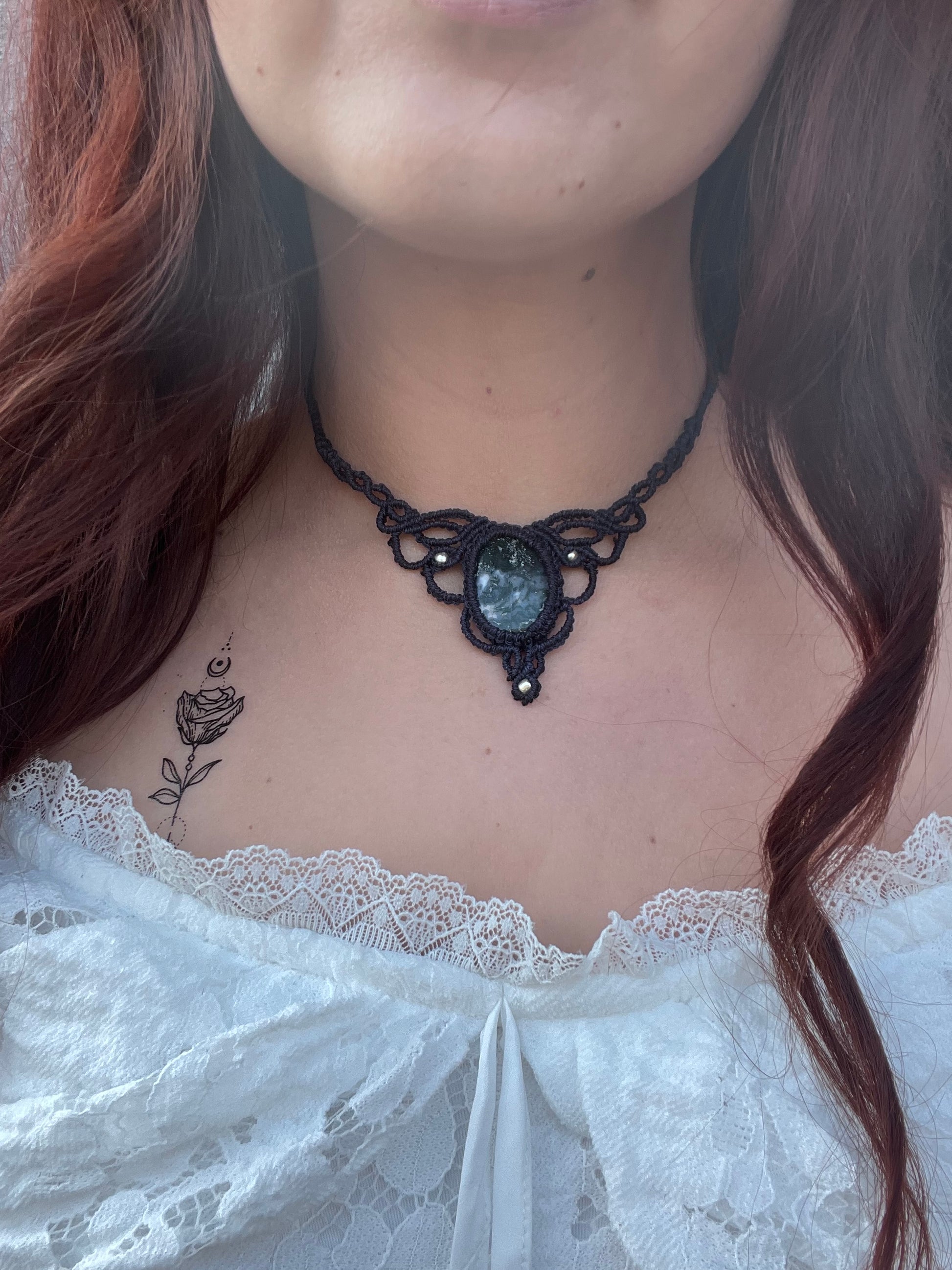 Tento náhrdelník působí mysticky, jemně a lehce goticky. Velmi tmavě modrý macramé vzor a zelenkavý kámen mají lesní až čarodějný nádech.