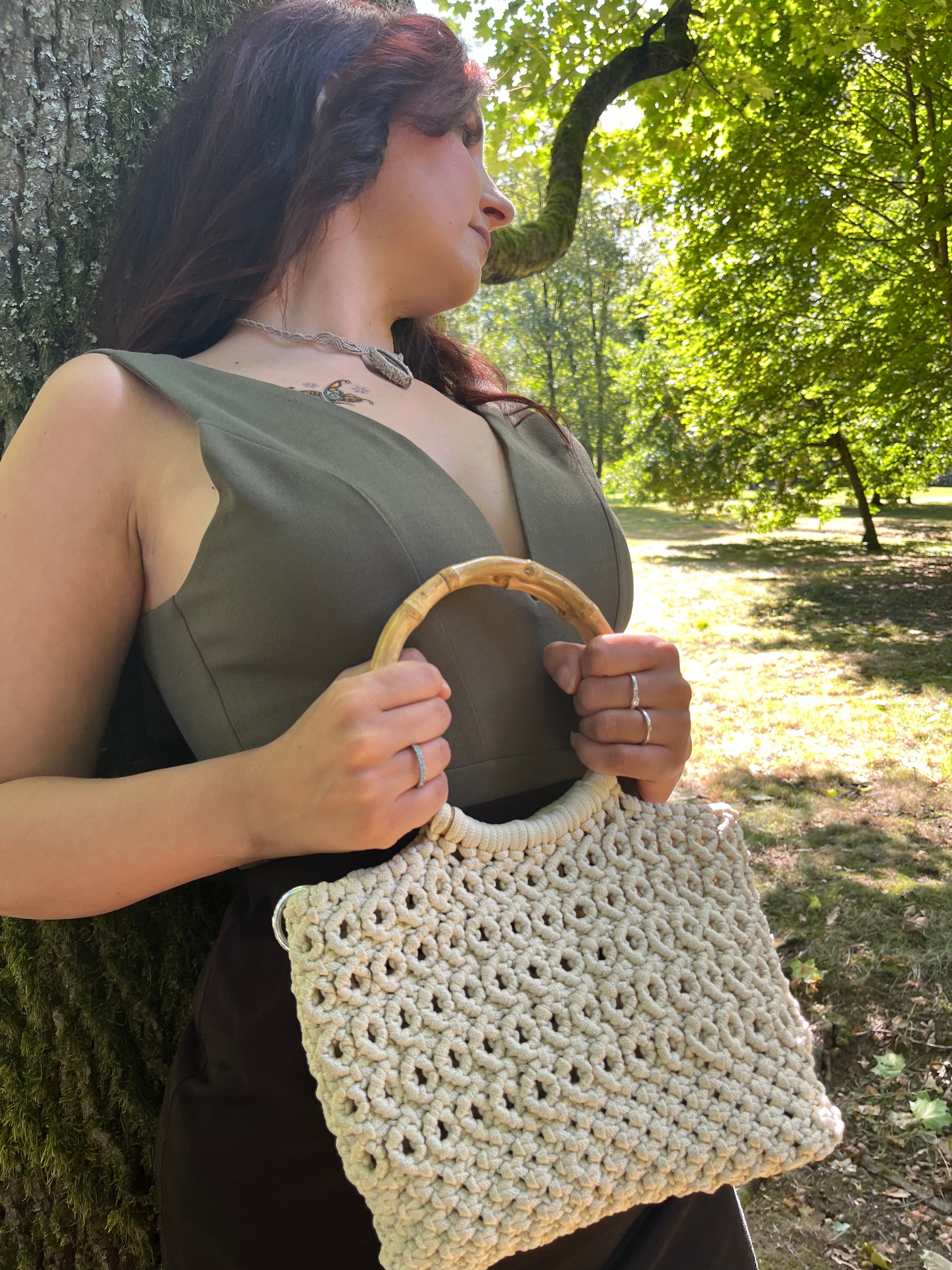 Tato ručně pletená macrame kabelka s bambusovým uchem a šampaň barvou je jemná, elegantní a zároveň i neutrálním doplňkem ke každému outfitu.